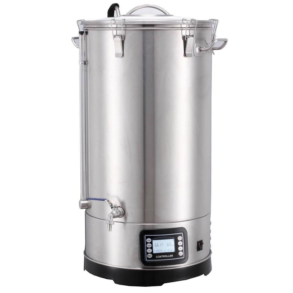 Equipo integral para lotes medianos (65–70 L) con canasta para ~20 kg de malta, mirilla de nivel y tapa sellada. Panel digital con escalas de maceración y memoria de recetas. Alimentación 220 V (potencia alta para hervidos vigorosos). Diseñado para cerveceros artesanales que requieren control, rendimiento y saneamiento en un solo vaso.